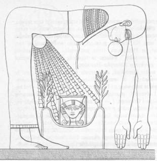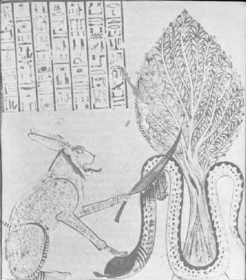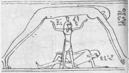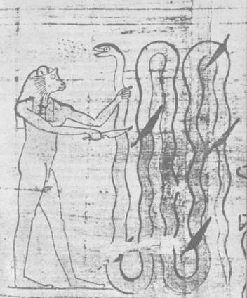 34. Personifikacja Nun. Przerys z Papirusu mitologicznego Chonsu--Mes, XXI dynastia. Paryż, Bibliotheque Nationale.