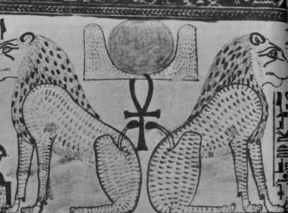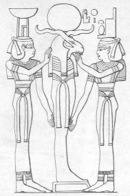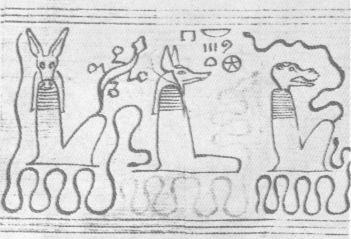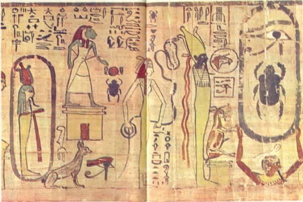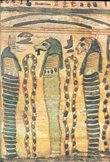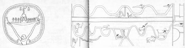 1. Chepri — wschodzące słońce płynące barka po Państwie Umarłych. Wielki wąż umieszczony pod spodem to Apop, odwieczny wróg słońca.