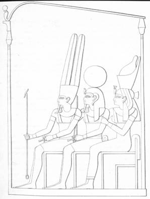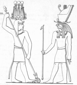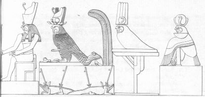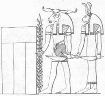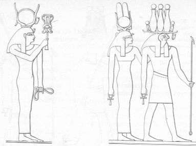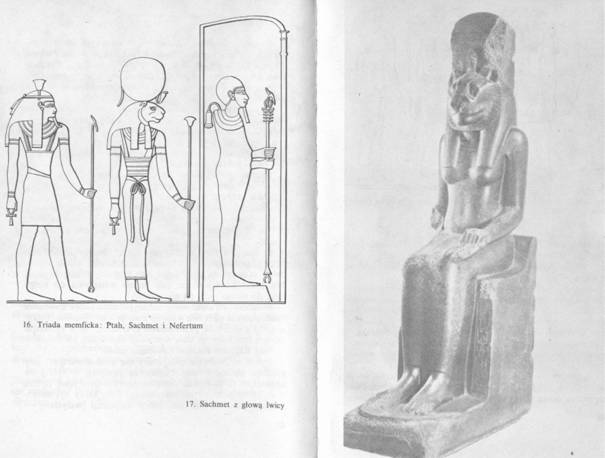 Ptah i Sachmet — przerys reliefu z kolumny w sali hypostylowej ze świątyni Ptaha w Karnaku, XX dynastia. Nefertum — przerys reliefu z grobowca Tauseret w Dolinie Królów.