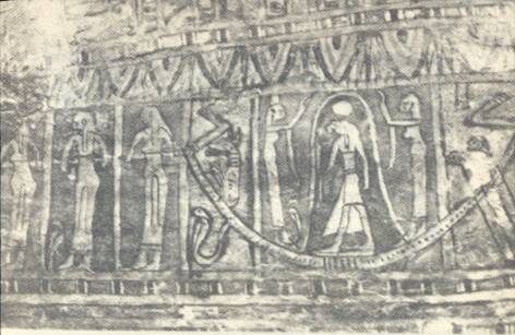 46. Druga brama Państwa Ozyrysa i jej strażnicy. Przerys malowidła z grobowca królowej Nefertari w Dolinie Królowych w Tebach XIX dynastia.