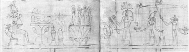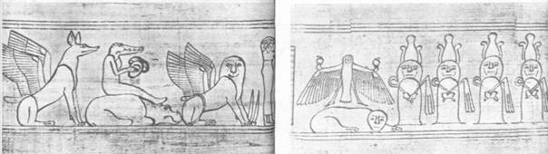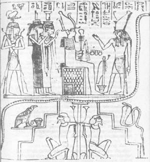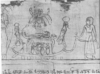 36. Ożywienie Ozyrysa. Winieta z Papirusu mitologicznego Pa-di--Amona. XXI dynastia. Kair, Muzeum Egipskie.