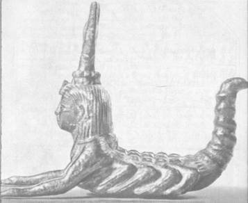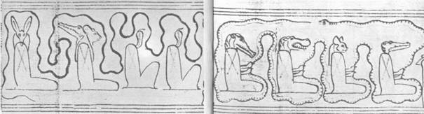 60. Horus przebijający harpunem Seta. Przerys winiety z Papirusu Jumilhac, koniec l w. p.n.e. Paryż, Luwr.