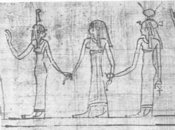 67. Izyda i Neftyda pozdrawiają byka Apisa. Przerys winiety z Papirusu Jumilhac, koniec I w. p.n.e. Paryż, Luwr.