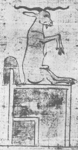 58. Święty Kozioł Ba-neb-Dżed z. Mendes. Przerys z Papirusu mitologicznego Her-Uben B, XXI dynastia. Kair, Muzeum Egipskie.