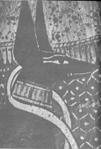 74. Święta Kotka (?) z Heliopolis zabija węża Apopa. Malowidło ^w grobowcu Inherka w Deir el-Medina, XIX dynastia. Fot. T. Biniewski.