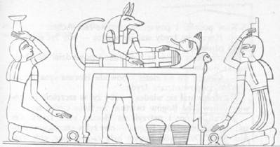65. Anubis z mumią i płaczki. Przerys reliefu ze ściany zachodniej skalnego grobu dostojnika imieniem Pen-nut w Aniba.