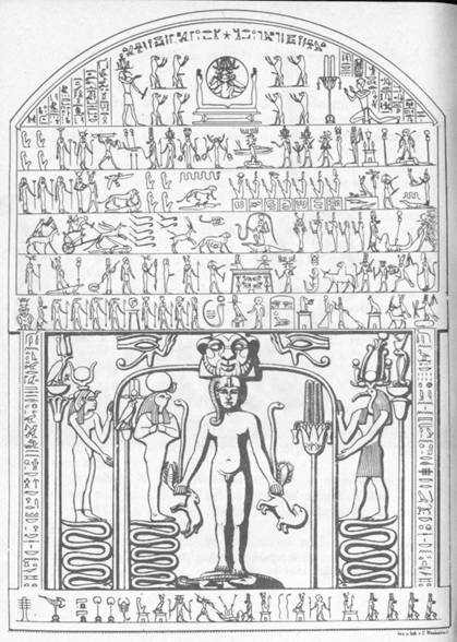 50. Adoracja Chepri. Re. Atuma. Ozyrysa. Izydy i Neftydy. Stela Nes-Mina. Okres Ptolemejsko-Rzymski. Kair, Muzeum Egipskie.